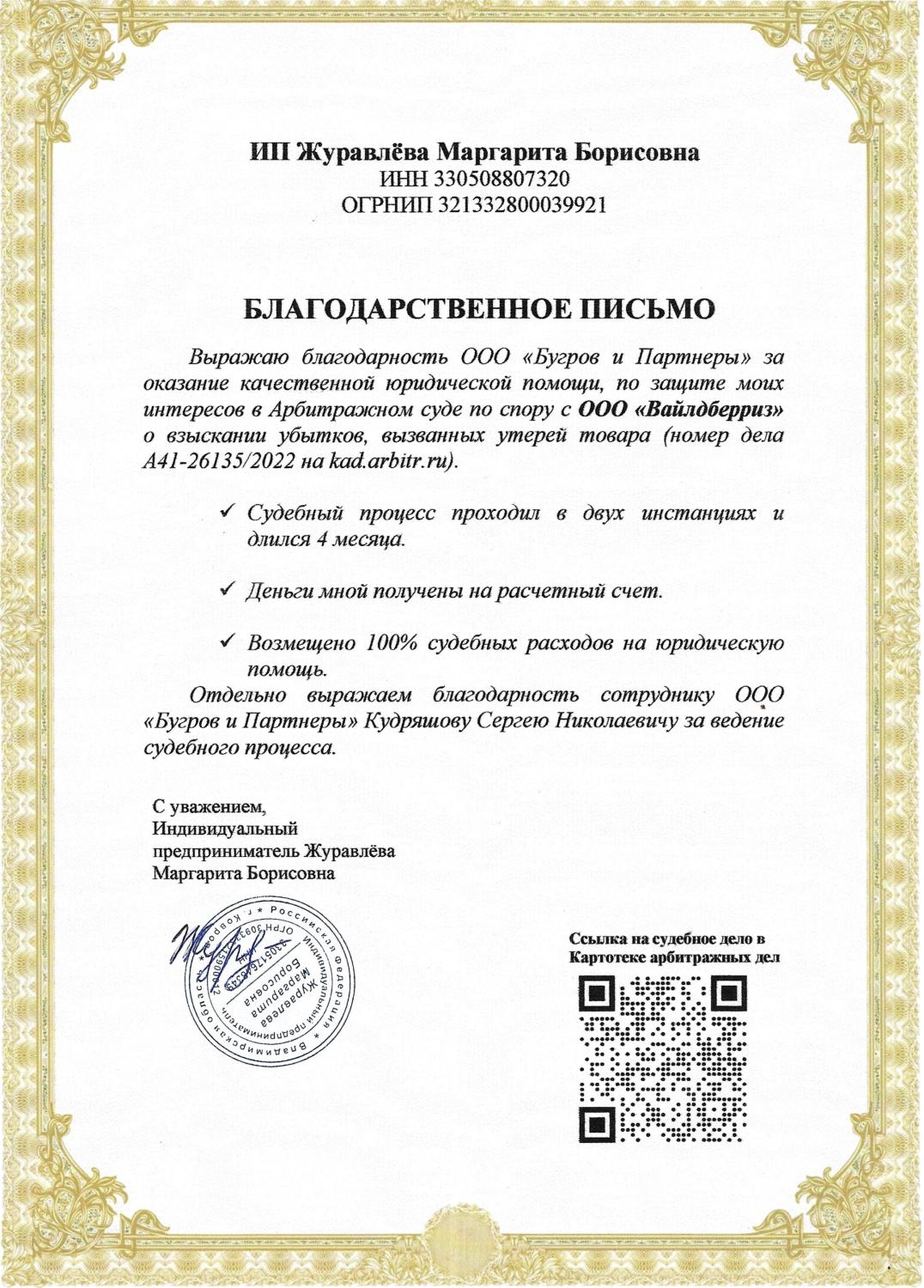 Благодарственное письмо от ИП Журавлёва Маргарита Борисовна